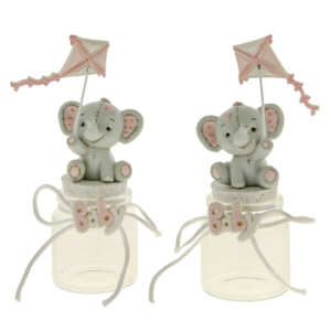 Bomboniera battesimo e nascita, nuova collezione 2023. Barattolo con elefantino con aquilone in resina. Colore azzurro o rosa in 2 posizioni assortite.