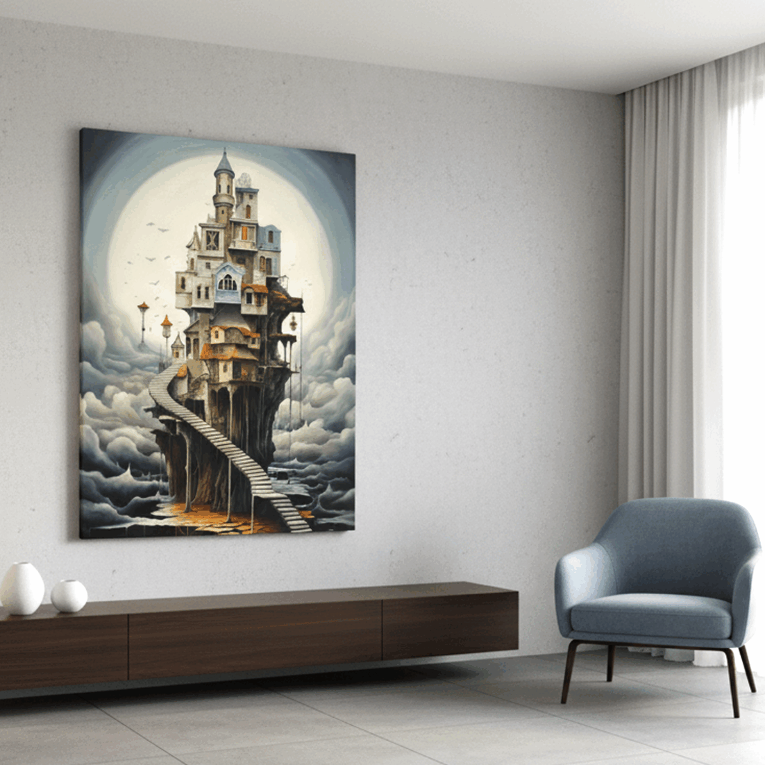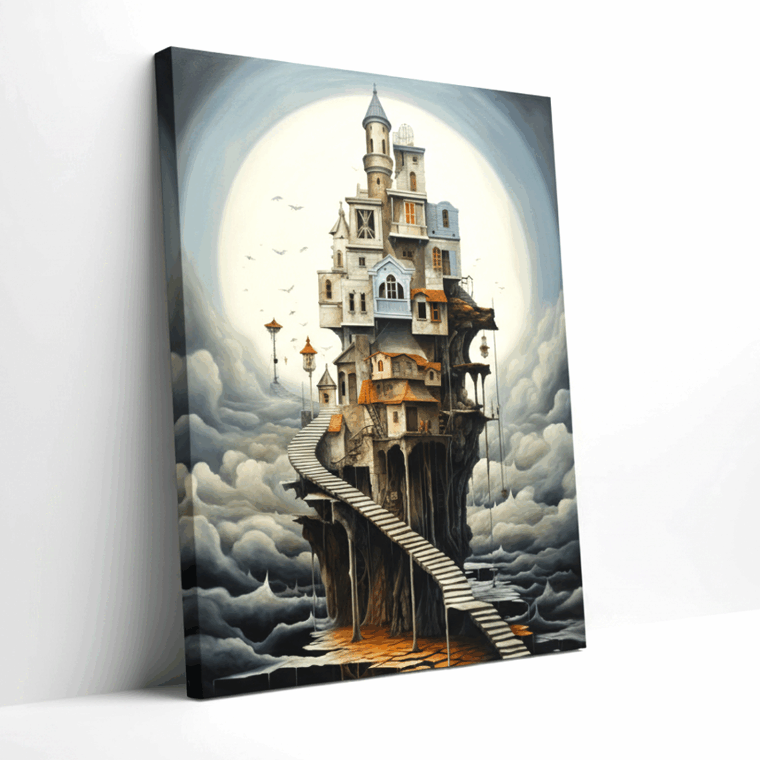 Una lunga scalinata sospesa si arrampica tra le nuvole e conduce a una casa impossibile: torri, tetti e finestre si incastrano come pezzi di un sogno, sfidando la gravità. In questo quadro surreale moderno, ogni livello sembra nascondere una storia, ogni balcone attende un nuovo personaggio, trasformando la parete in una scena da esplorare con lo sguardo.