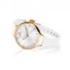 Cassa rotonda in acciaio anallergico placcato oro rosa dal diametro di 28 mm. Lunetta impreziosita da zirconi bianchi.
