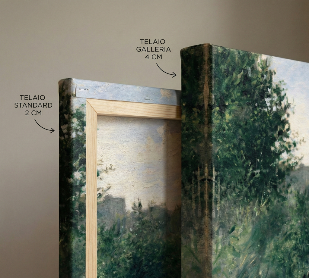 Telaio Galleria (spessore 4 cm): Per un impatto visivo più deciso e importante. Questo spessore maggiore conferisce all’opera una presenza tridimensionale, simile a quella di un quadro esposto in una galleria. L’immagine è stampata anche sui bordi laterali (gallery wrap) per una finitura impeccabile che non necessita di cornice esterna.