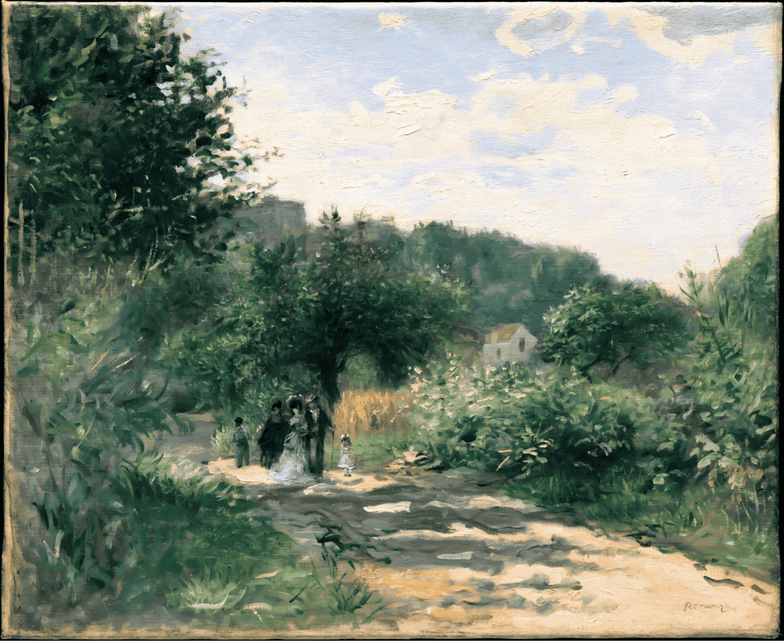 Realizzato nel 1872, “Strada a Louveciennes” è un esempio significativo e affascinante dello stile impressionista di Pierre-Auguste Renoir. L’opera, il cui originale è conservato presso il prestigioso Metropolitan Museum of Art di New York, raffigura un sereno paesaggio rurale. La scena è dominata da un sentiero sterrato che si snoda nella natura, animato da figure umane: un gruppo di persone che passeggia e due bambini, immersi nella tranquillità del luogo. La maestria di Renoir si manifesta nell’uso magistrale della luce naturale che filtra tra gli alberi e nelle pennellate vibranti che donano movimento e vita alla composizione, catturando l’essenza di un momento fuggente.